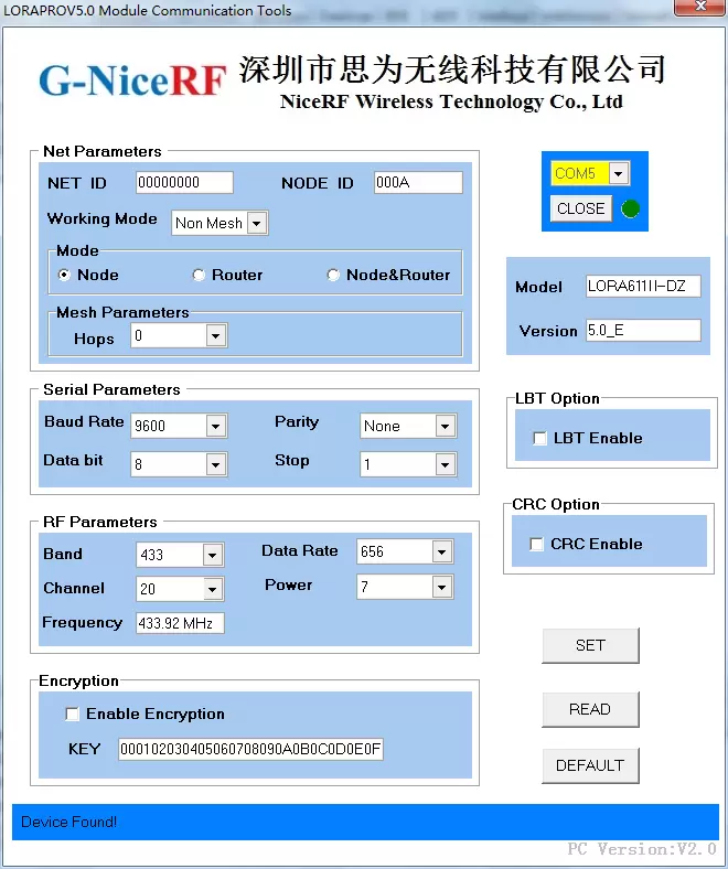 No modo de configuração, os usuários podem configurar os parâmetros do módulo através do software do PC. Após abrir o software do PC, clique para abrir a porta COM correspondente (que pode ser verificada no Gerenciador de Dispositivos), e o PC lerá os parâmetros do módulo conectado e exibirá as informações do modelo e versão correspondentes na janela. Ao mesmo tempo, a mensagem 'Dispositivo encontrado!' será mostrado na barra de status na parte inferior. Quando o dispositivo for desconectado ou não houver resposta, a barra de status na parte inferior exibirá a mensagem “Dispositivo não encontrado!” e a caixa de informações do produto acima ficará cinza e inativa. A interface do PC quando o módulo é conectado com sucesso é mostrada na figura a seguir.