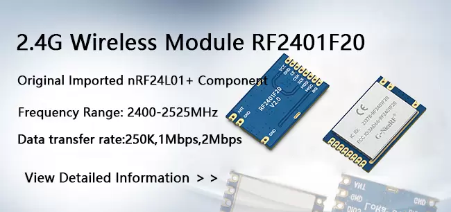 RF2401F 20 é um módulo sem fio de 2,4 GHz que usa modulação GFSK e suporta 126 canais. Possui potência de saída de até 20dBm e alta sensibilidade do receptor, permitindo comunicação sem fio estável e de longa distância.