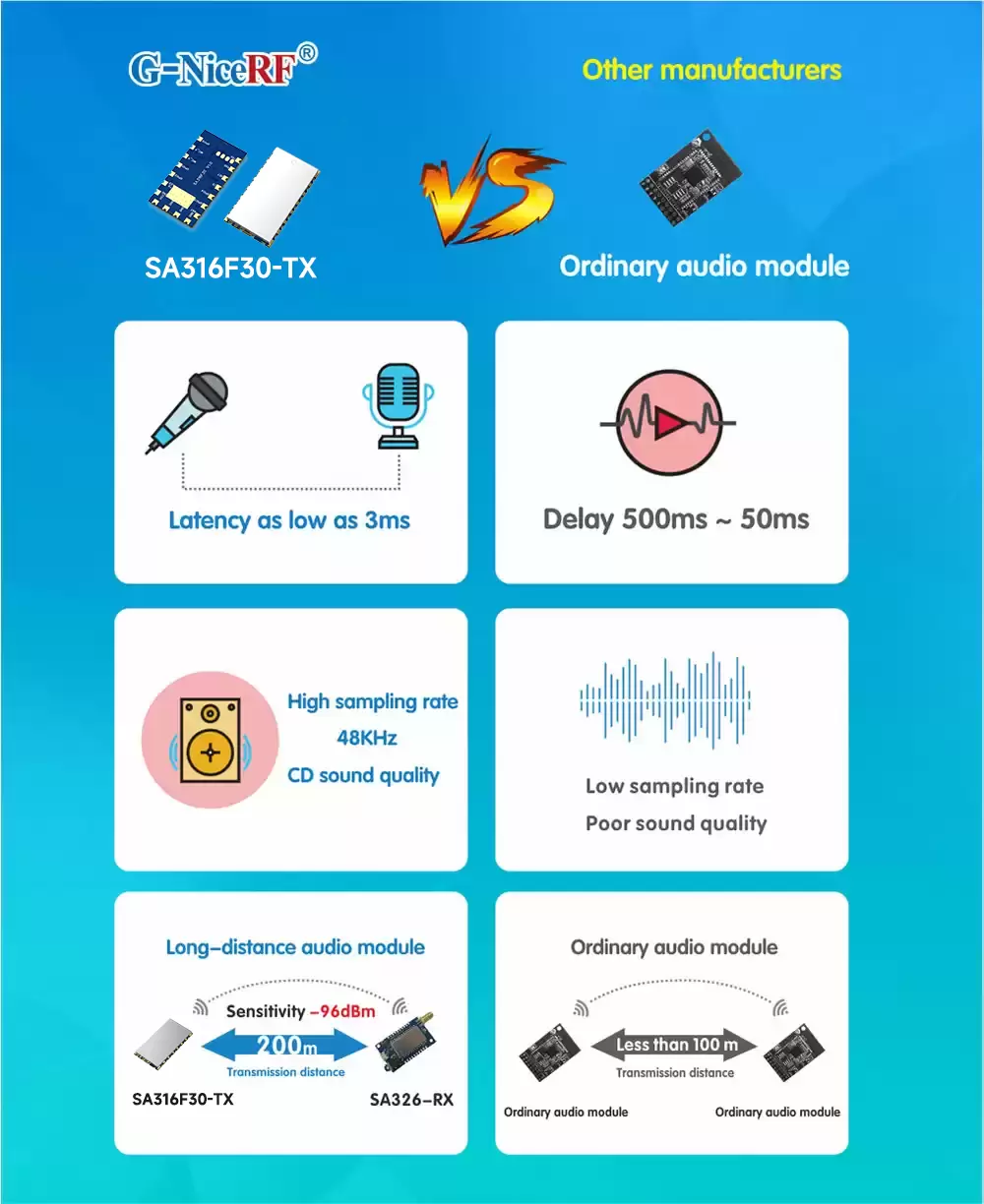 Esta atualização da distância de transmissão do módulo de áudio da série SA316 mantém as características de baixo consumo de energia, tamanho pequeno, alta fidelidade e baixa latência do SA316. A saída de áudio receptora, como o SA316, tem latência inferior a 3ms e os dados são criptografados com entrada de 32 bits.