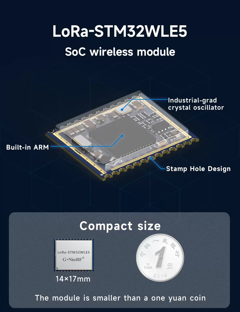 O módulo sem fio SOC tem um volume de 17*14 (unidade mm) e um design de furo de carimbo ultrapequeno para facilitar o desenvolvimento secundário pelos usuários. Braço de núcleo RISC de 32 bits Arm® Cortex®-m4 integrado, acoplado a um oscilador de cristal de nível industrial com uma temperatura de 40-85 ° C, pode ser usado em aplicações de nível industrial.