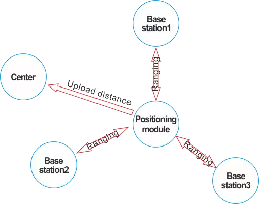 ◆ O módulo de posicionamento é instalado nas mercadorias a serem localizadas, mede ao centro as distâncias entre as três estações base separadamente (status de alcance) e carrega essas três distâncias para o centro (status de comunicação).